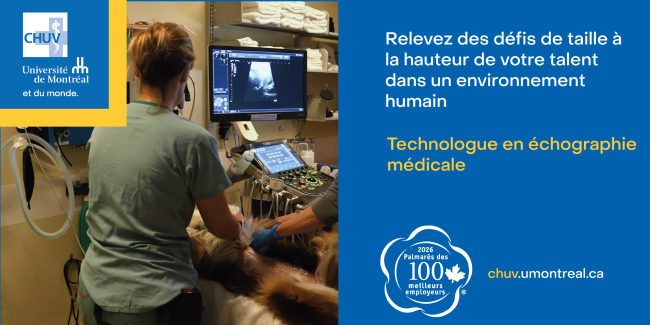 TECHNOLOGUE EN ÉCHOGRAPHIE MÉDICALE Poste régulier à temps complet Le Centre hospitalier universitaire vétérinaire (CHUV) de la Faculté de médecine vétérinaire offre une expertise clinique, des soins et une expérience client de première qualité, centrés sur le bien-être et la santé des animaux. Au sein d’une faculté d’enseignement et de recherche vétérinaire, il constitue une…