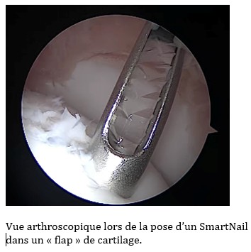 L’émergence récente d’implants biorésorbables tels que les implants de type Smart Nail®, permet désormais la compression des « flaps » cartilagineux, et favorise leur rattachement et leur cicatrisation. Cette approche permet d’améliorer significativement le pronostic sportif en évitant un débridement extensif, lorsque la lésion est identifiée tôt. Le succès de cette approche repose ainsi sur un diagnostic précoce, avant le détachement complet ou l’ossification partielle du flap, l’âge optimal d’intervention se situant entre 8 et 10 mois.